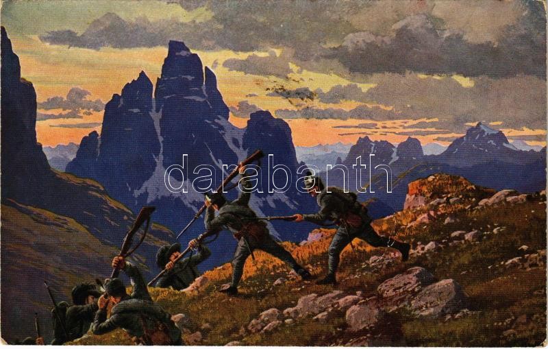 Description: Im Kampf um Tirol. "Ein kritischer Augenblick" / WWI Austro-Hungarian K.u.K. military art postcard, mountain troops fighting the Italians in Tyrol (EK)