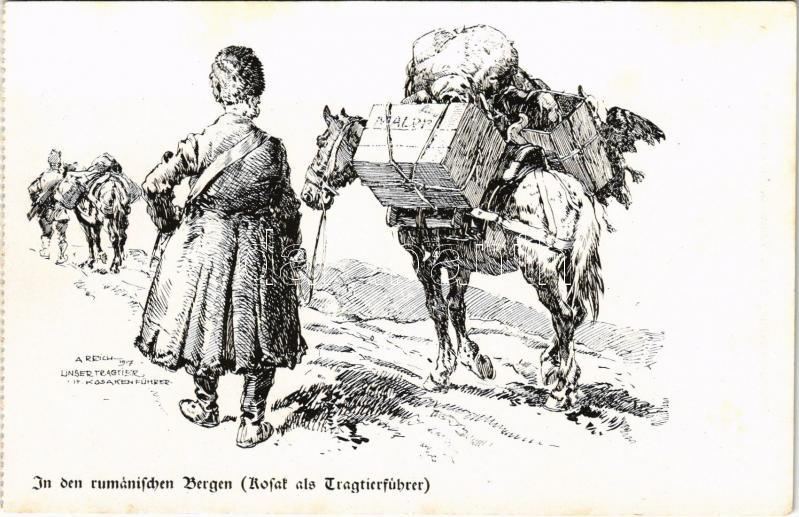 Description: In den rumänischen Bergen (Kosak als Tragterführer). Feldbuchhandlung der IX. Armee und Donauarmee / WWI Austro-Hungarian K.u.K. military art postcard s: A. Reich