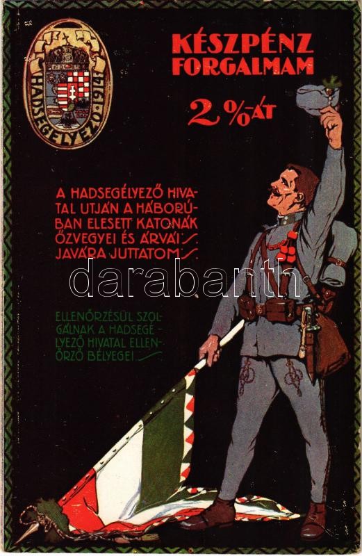 Description: "Készpénz forgalmam 2%-át a hadsegélyező hivatal útján a háborúban elesett katonák özvegyei és árvái javára juttatom" A M. Kir. Honvédelmi Minisztérium Hadsegélyező Hivatalának kiadása / WWI Austro-Hungarian K.u.K. military art postcard, patriotic propaganda, support fund