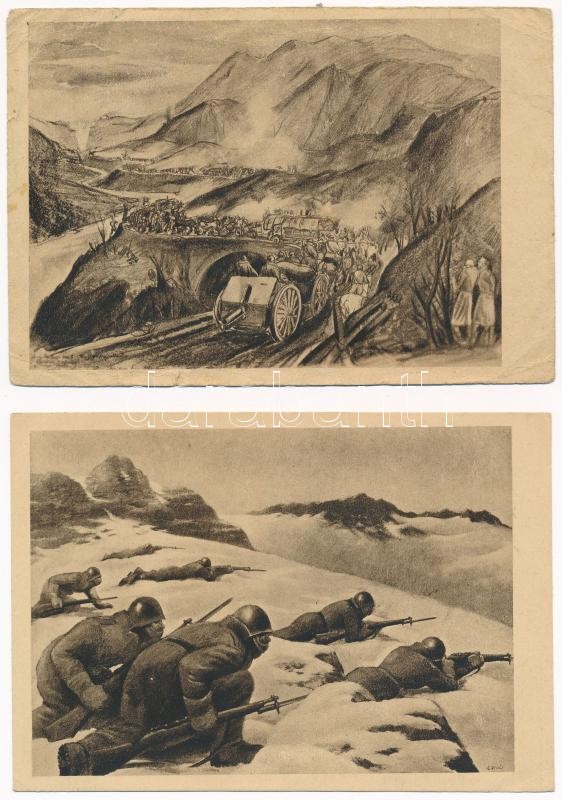 Description: Olasz kir. vezérkar - Hadbavonult olasz művészek kiállítása - 2 db második világháborús katonai képeslap / 2 pre-1945 WWII Italian military art postcards (Vittorio Caroli, Gian Luigi Uboldi)
