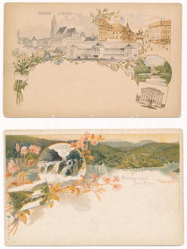 Description: 2 db RÉGI barna 2 Ga. díjjegyes Ezredéves Kiállítás művészlap: Zágráb, Plitvicei tavak / 2 pre-1900 brown Ga. Hungarian Millenium Exposition art postcards: Zagreb and Plitvice Lakes