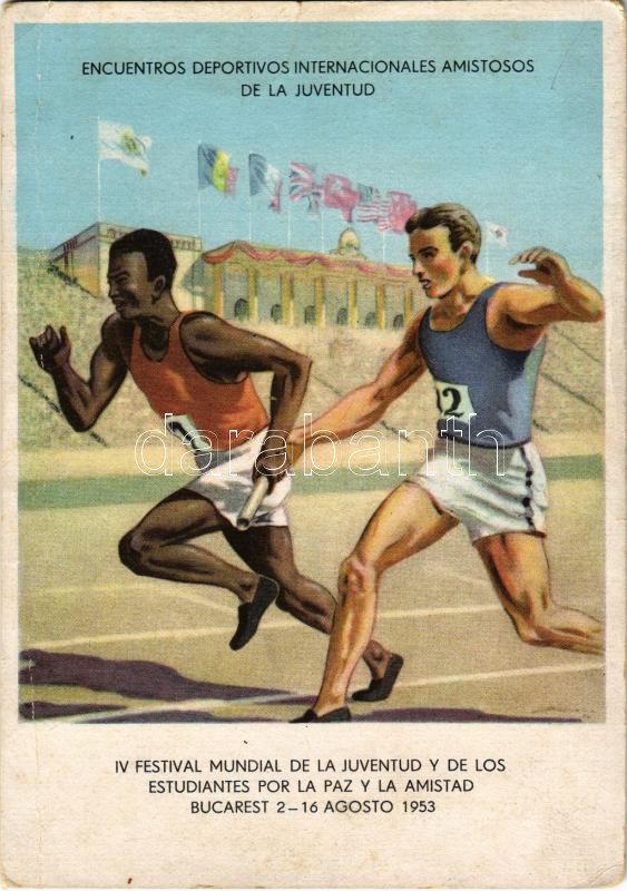 Description: 1953 Bucharest, Bukarest, Bucuresti, Bucuresci; IV Festival Mundial de la Juventud y de los Estudiantes por la par y la Amistad Bucarest. Encuentros Deportivos Internationales Amistosos de la Juventud / 4th World Festival of Youth and Students for Parity and Friendship, International Youth Friendly Sports Meetings (EK)