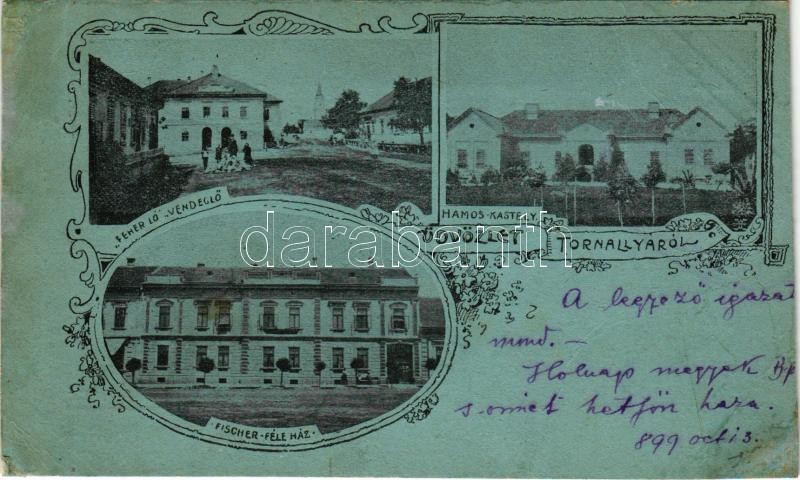 1899 (Vorläufer) Tornalja, Tornallya, Safárikovo, Tornala; Fehér Ló vendéglő, Hámos kastély, Fischer-féle ház / restaurant, inn, castle. Art Nouveau, floral (r)