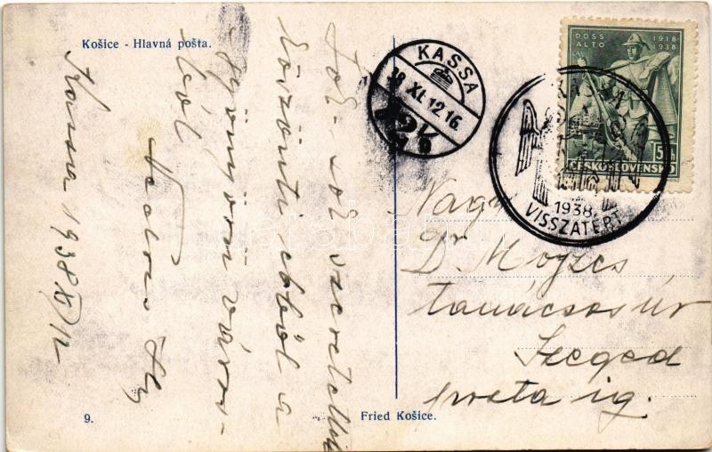 1938 Kassa, Kosice; Hlavná posta / Posta / post office + "1938 Kassa visszatért" So. Stpl. (EK)
