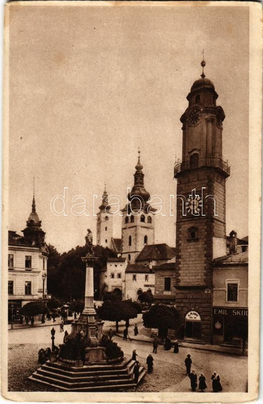 Description: Besztercebánya, Banská Bystrica; Mestsky dom so zvonicou a farnym kostolom / Városháza, Plébániatemplom és harangtorony, Emil Skoda üzlete / town hall, parish church, bell tower, shops (kopott sarkak / worn corners)