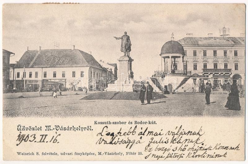 Description: 1903 Marosvásárhely, Targu Mures; Kossuth szobor, Bodor-kút, Takarékpénztár, Temesvári M., Bucher Lajos üzlete. Weinrich S. udvari fényképész felvétele / statue, fountain, savings bank, shops (EK)