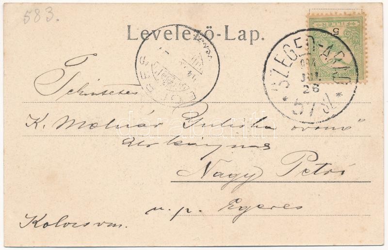 Description: 1904 Nagyszentmiklós, Sannicolau Mare; M. kir. földműves iskolai tanulók a telep részletén / agricultural farmer school, farmer students + "SZEGED - ARAD 67. SZ." vasúti mozgóposta bélyegző