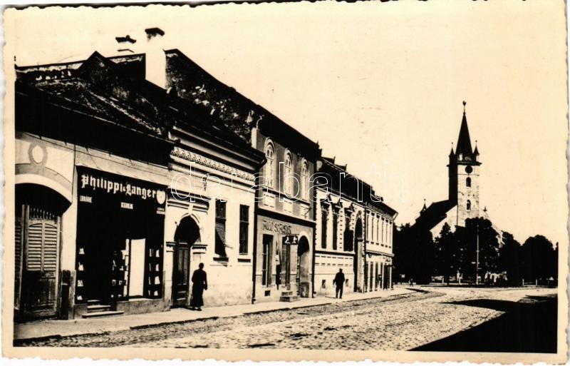 19400 Szászrégen, Reghin; utca, templom, Philippi & Langer könyvnyomda üzlete és saját kiadása / street, church, shops