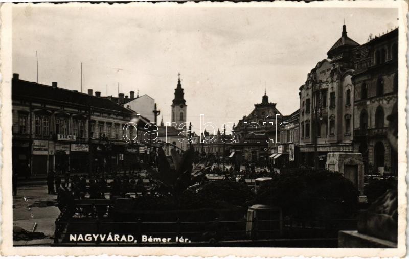1942 Nagyvárad, Oradea; Bémer tér, Friedmann, Hollós Pál, Szenszki Sándor, Sipos, Lőrincz üzlete / square, shops (fl)