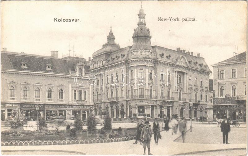 Kolozsvár, Cluj; New York palota, Jeszenszky Ferenc, Csiky Mihály, Schefer András, Tauffer Dezső, Schuster Emil üzlete / palace, shops (EK)