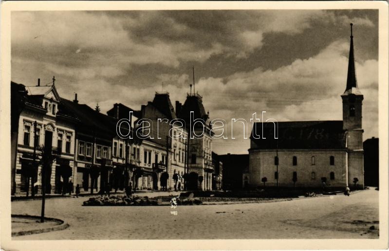 Székelyudvarhely, Odorheiu Secuiesc; Mátyás király tér, templom, üzletek. Kováts István fényképész kiadása / square, church, shops