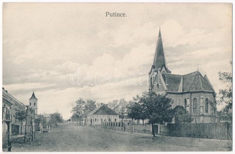 Petőc, Putince, Putinci; utca, templom. Eschbach kiadása / street view, church