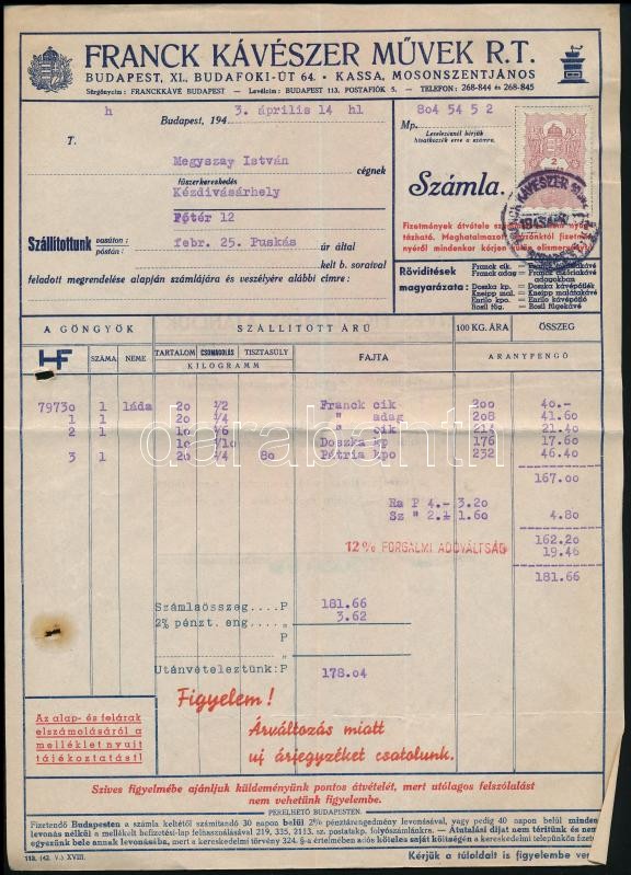 1943 Bp., Franck Kávészer Művek Rt. fejléces számlája