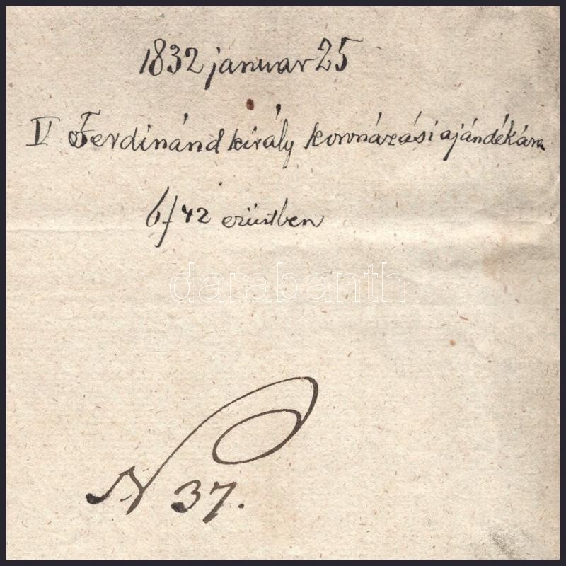 1832 V. Ferdinánd király koronázása alkalmából a nemesek által felaján... https://www.darabanth.com/en/413-Online-auction/413.0/Art-and-other-collectibles/Historical-documents-manuscripts~500019/1832-V-Ferdinand-kiraly-koronazasa-alkalmabol-a-nemesek-altal-felajanlott-50-000-aranyforin~II2574949