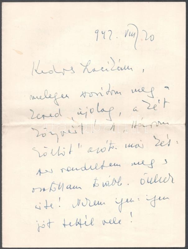 Description: Győry Dezső (Wallentinyi) (1900-1974) háromszoros József Attila-díjas költő, író, újságíró. autográf levele Vass László (1905-1950) újságíró, kritikusnak irodalmi és magánéleti kérdésekről, megemlítva Móricz Zsigmondot is. 3 beírt oldal