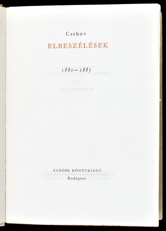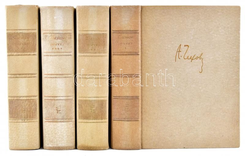 Anton Pavlovics Csehov művei: I.-IV. kötetek. Teljes. Bp., 1960., Európa. Kötetenként 1-1 rézmetszetű Csehov portréval, Vertel József, Gerstenbrein Ferenc, Nagy Zoltán, és Füle Mihály munkáival. Kiadói egészbőr-kötésben, a lapéleken kis elszíneződés egy két helyen, néhány lap gyűrött. Centenáriumi kiadás, készült az író születésének 100. évfordulójára.