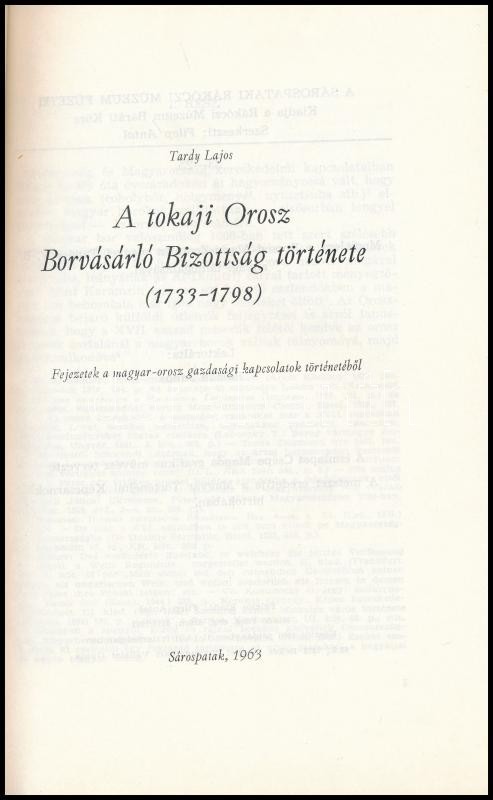 Tardy Lajos: A tokaji Orosz Borvásárló Bizottság története. (1733-1798... https://www.darabanth.com/en/413-Online-auction/413.0/Books/Books-Travelling-Local-History~1000004/Tardy-Lajos-A-tokaji-Orosz-Borvasarlo-Bizottsag-tortenete-1733-1798-Fejezetek-a-magyar-or~II2576395