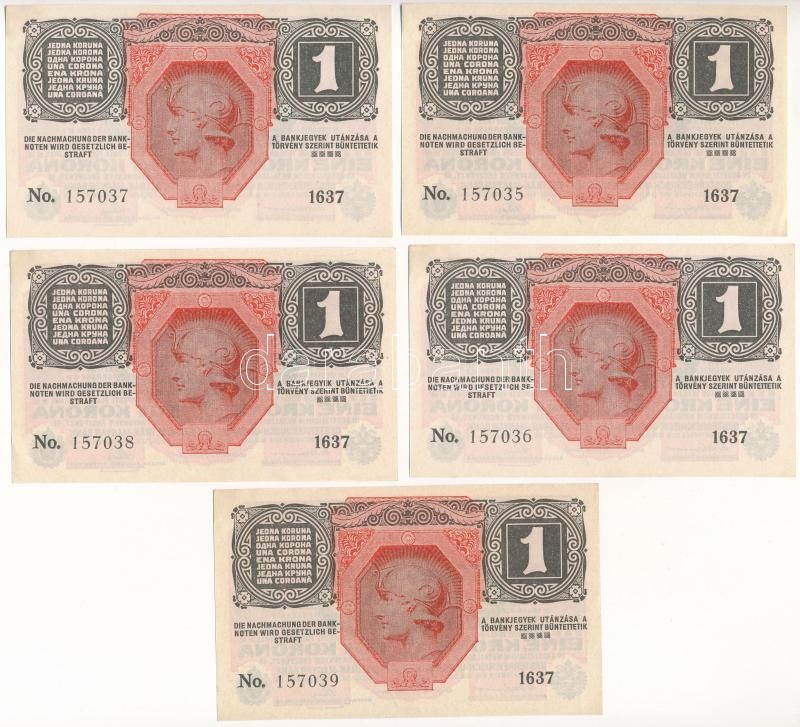 1916. 1K (5x, sorszámkövetők) zöld "DEUTSCHÖSTERREICH" felülbélyegzéss...