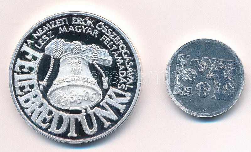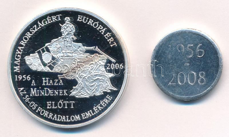 Description: 2006. "A Nemzeti Erők Összefogásával lesz magyar feltámadás! - Felébredtünk / Magyarországért Európáért - A Haza nindenek előtt - 1956-2006 - Az '56-os forradalom emlékére" ezüstözött fém emlékérem tanúsítvánnyal (42,5mm) + 2008. "1956-2008 / '56. október 23." Al zseton (25mm) T:1- (PP), 2