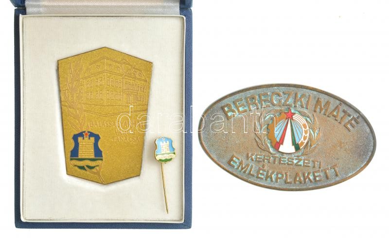 ~1970-1980. "Bereczki Máté Kertészeti Emlékplakett" Br plakett, zománcozott betéttel (64x105mm) + "Balassagyarmat Város Tanácsa" fém plakett, zománcozott jelvénnyel, kopott tokban (~80x50mm) T:2 patina