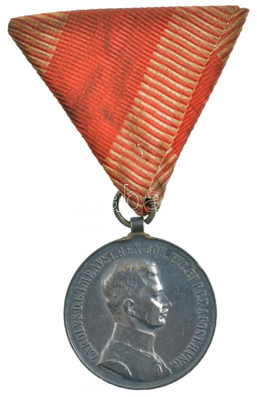 1917. "Károly Ezüst Vitézségi Érem II. osztálya" peremén jelzett Ag kitüntetés mellszalagon. Szign.: Kautsch T:2- patina, ph.