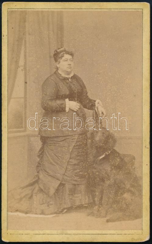 cca 1880 Nő kutyával, keményhátú fotó Fieber műterméből, 10,5×6,5 cm