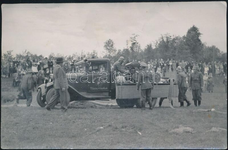 cca 1930-1940 Sárvár nagyközség tűzoltósága bemutatót tart, fotó, felü...