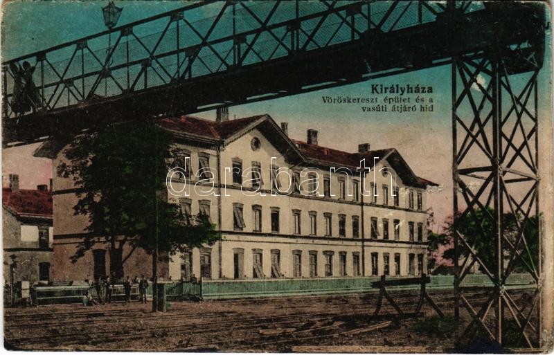 1917 Királyháza, Korolevo, Královo nad Tisou; Vöröskereszt épület és a vasúti átjáróhíd / Red Cross building at the railway station (EB)