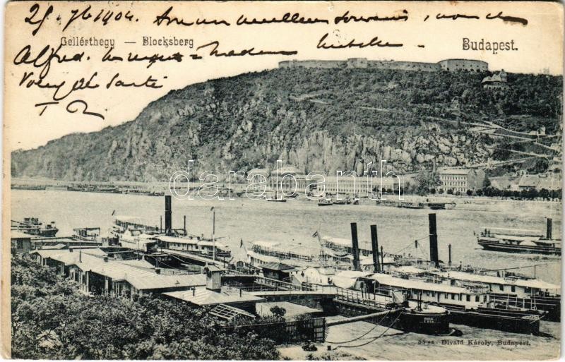 1904 Budapet XI. Gellérthegy, hajóállomás, gőzhajók, Citadella. Divald...