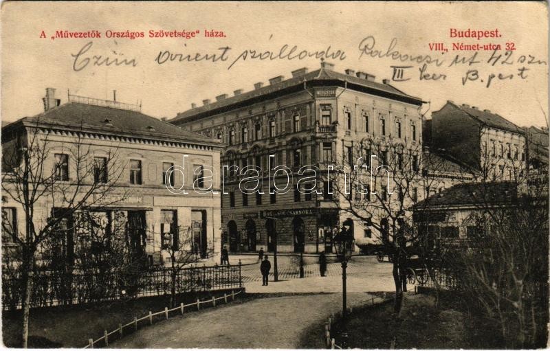 Description: 1910 Budapest VIII. A Művezetők Országos Szövetsége háza, B. Nagy Károly üzlete, bor- és sörcsarnok. A Művezetők Országos Szövetsége kiadása, Német utca 32. (fl)