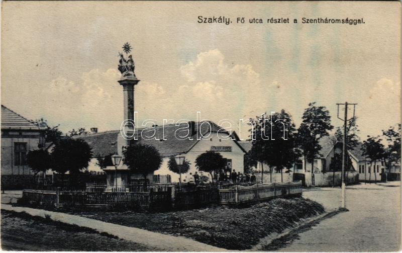 1939 Szakály, Fő utca, Szentháromság szobor, Hangya szövetkezet üzlete...