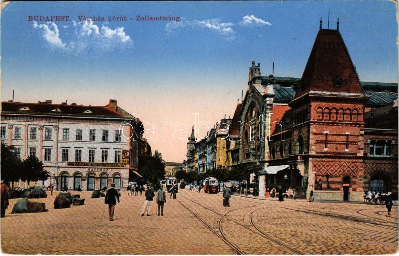 Budapest IX. Vámház körút, villamosok, Nádor szálloda, Koszorúszalag Nyomda, kávéház, Vásárcsarnok