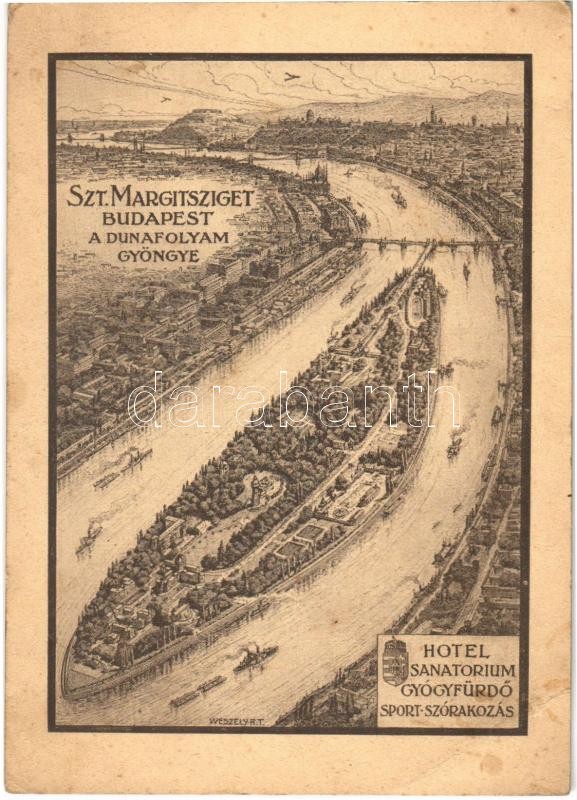 Budapest XIII. Szent Margitsziget, a Dunafolyam gyöngye, Hotel, Sanatorium, gyógyfürdő, sport és szórakozás. Weszely Rt. reklámlapja (EB)