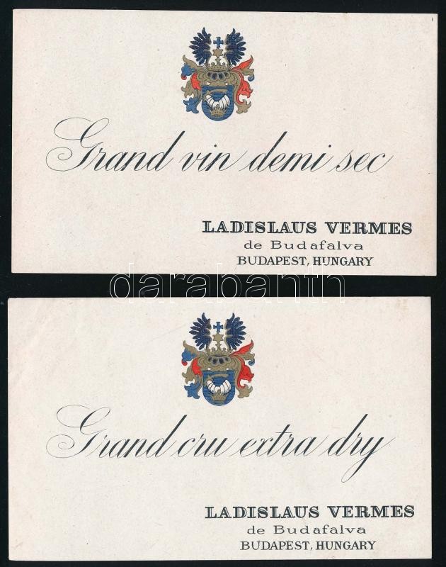 Ladislaus Vermes de Budafalva, "Grand vin demi sec" és "Grand cru extra dry", 2 db régi (1945 előtti), nemesi címerrel díszített borcímke