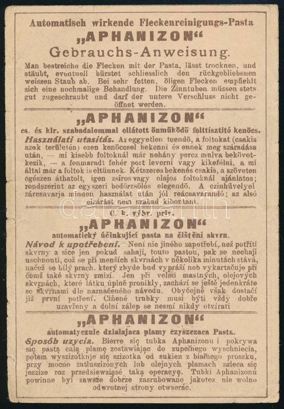 cca 1910 "Aphanizon" folttisztító kenőcs, kétoldalas litho reklámnyomtatvány, 12x8 cm