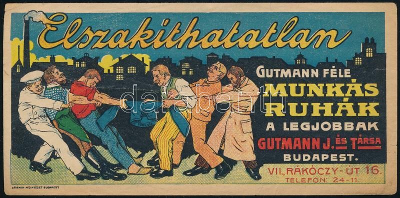 cca 1910 "Elszakíthatatlan. Gutmann féle munkás ruhák a legjobbak... https://www.darabanth.com/en/414-Online-auction/414.0/Art-and-other-collectibles/Advertisement~500022/cca-1910-Elszakithatatlan-Gutmann-fele-munkas-ruhak-a-legjobbak-Reklamos-szines-litografa~II2586454