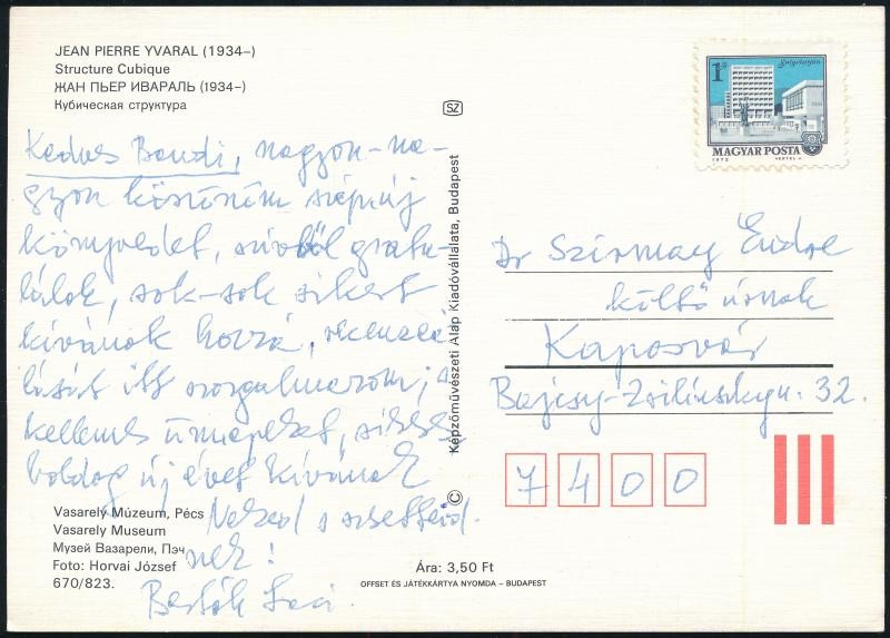Description: Bertók László (1935-2020) Kossuth- és József Attila-díjas író, költő saját kezű sorai és aláírása egy Szirmay Endre (1920-2013) költő, író, műfordítónak szóló képeslapon.