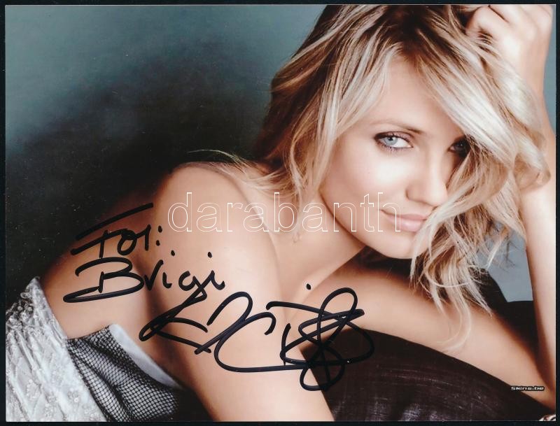 Cameron Diaz (1972-) színésznő aláírása az őt ábrázoló képen