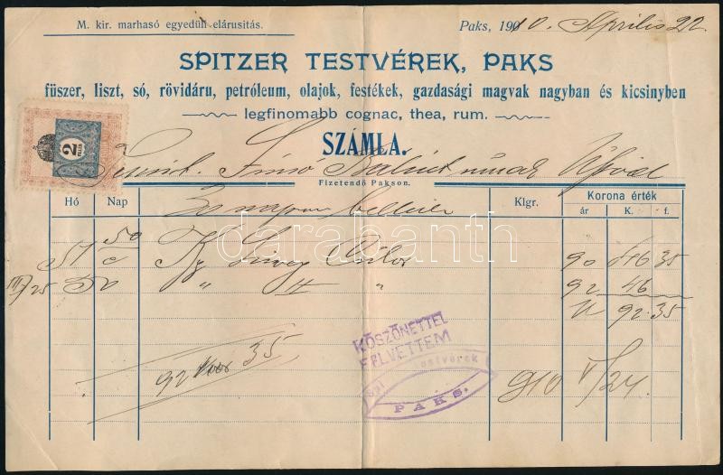 1910 Paks, Spitzer Testvérek fűszer, liszt stb. kereskedésének fejléces számlája illetékbélyeggel