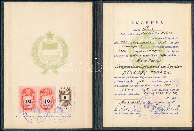 https://www.darabanth.com/en/414-Online-auction/414.0/Art-and-other-collectibles/Documents~500018/1957-Kozgazdasz-oklevel-es-leckekonyv~II2592803