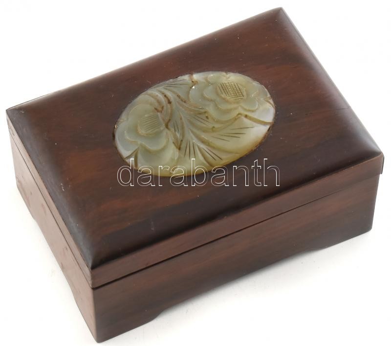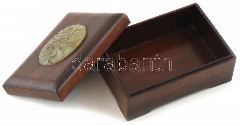 Fadoboz, tetején faragott jáde berakással, mahagóni, jelzés nélkül, kopásnyomokkal, 13x9x6,5cm