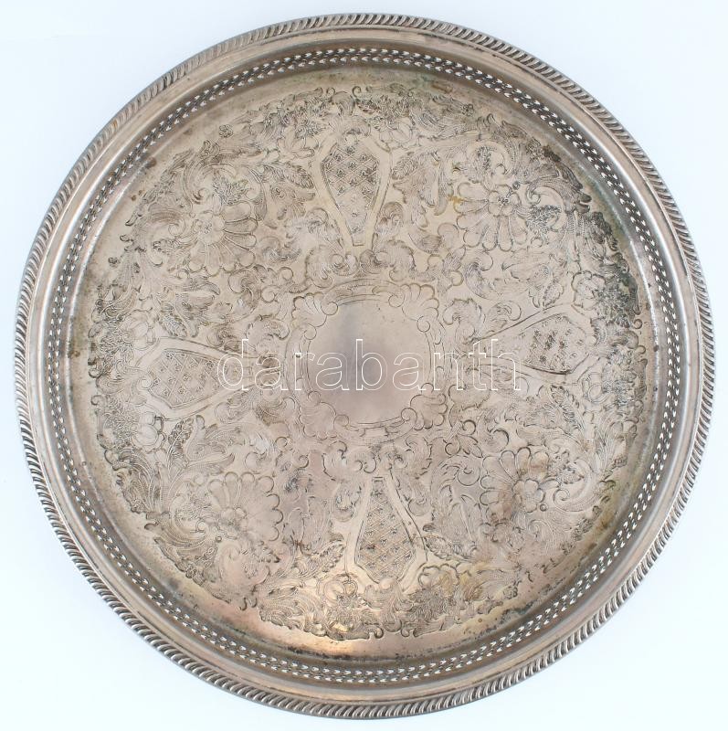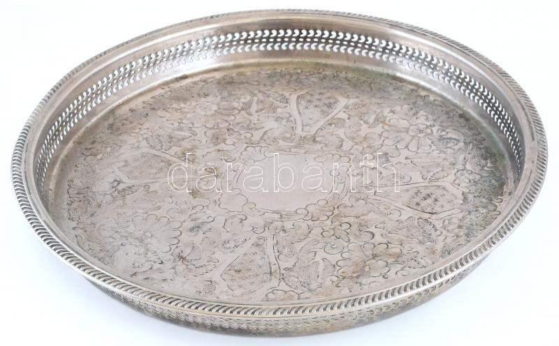 Kerek tálca, ezüstözött, áttört motívummal, jelzett, kopott, d:39cm