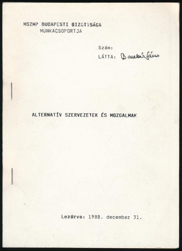 cca 1988-1989 Alternatív szervezetek és mozgalmak. MSZMP Budapesti Bizottsága Munkacsoportja. Sokszorosított gépirat, 20+125+6 p. Tűzött papírkötés.