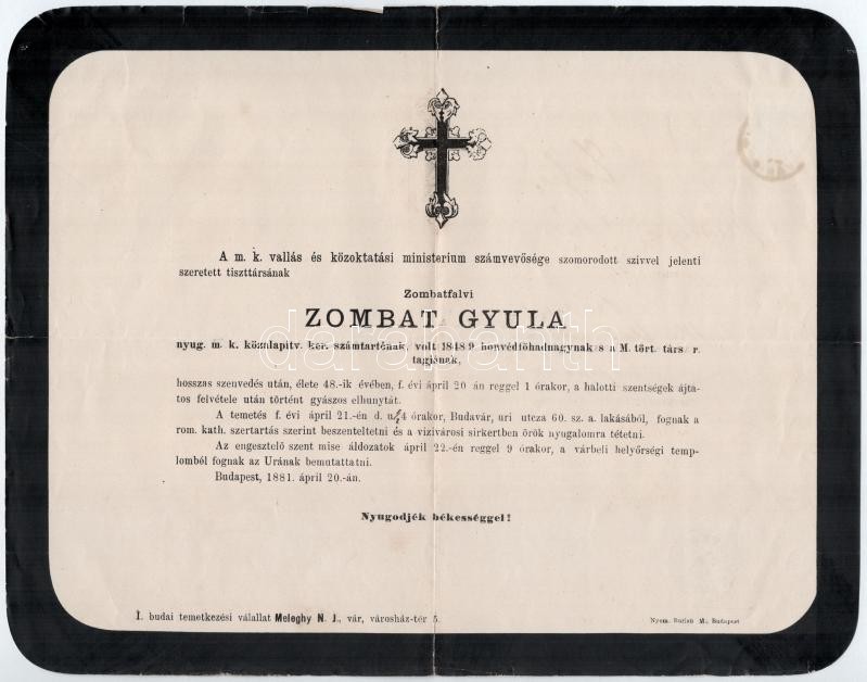 Description: 1881 zombatfalvi Zombath Gyula (1832-1881) egykori 1848-49-es honvédfőhadnagy, nyug. m. k. közalapítv. ker. számtartó, Magyar Történetelmi Társulat tagjának halálozási értesítője.