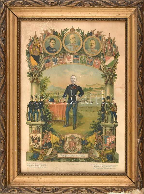 cca 1900-1910 "Szolgálati időm emlékéül." Emléklap Ferenc József, Ferenc Ferdinánd és Frigyes főherceg arcképével, a háttérben a budai királyi palotával, lánchíddal, alul címerekkel, Bp., Leitner M. L. és fia, nagyméretű litho emléklap, gyalogos katonával a közepén, sérült üvegezett fa keretben, foltos, 44x33 cm, teljes: 56x45 cm
