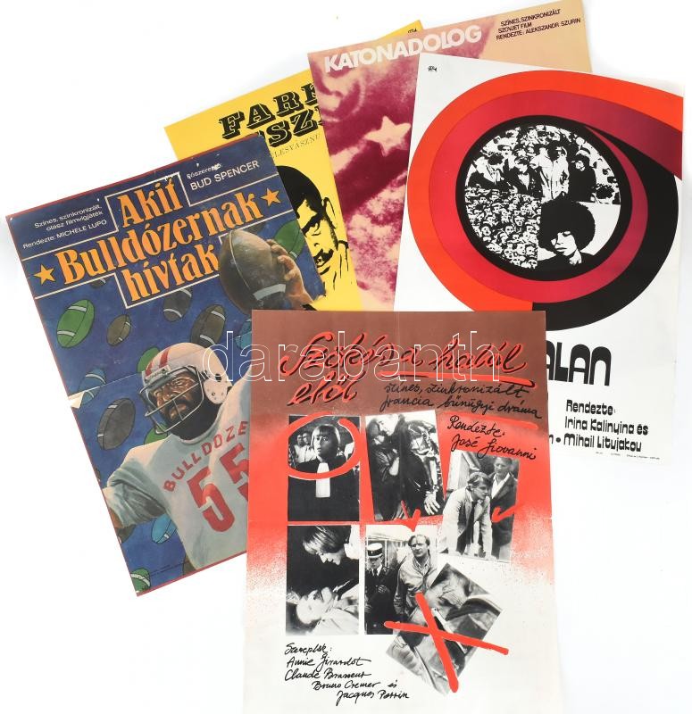 cca 1968-1982 5 db filmplakát: Nyugtalan ifjúság, Katonadolog, Farkas-... https://www.darabanth.com/en/414-Online-auction/414.0/Art-and-other-collectibles/Posters~1000006/cca-1968-1982-5-db-filmplakat-Nyugtalan-ifjusag-Katonadolog-Farkas-visszhang-Akit-Bulldozern~II2591296