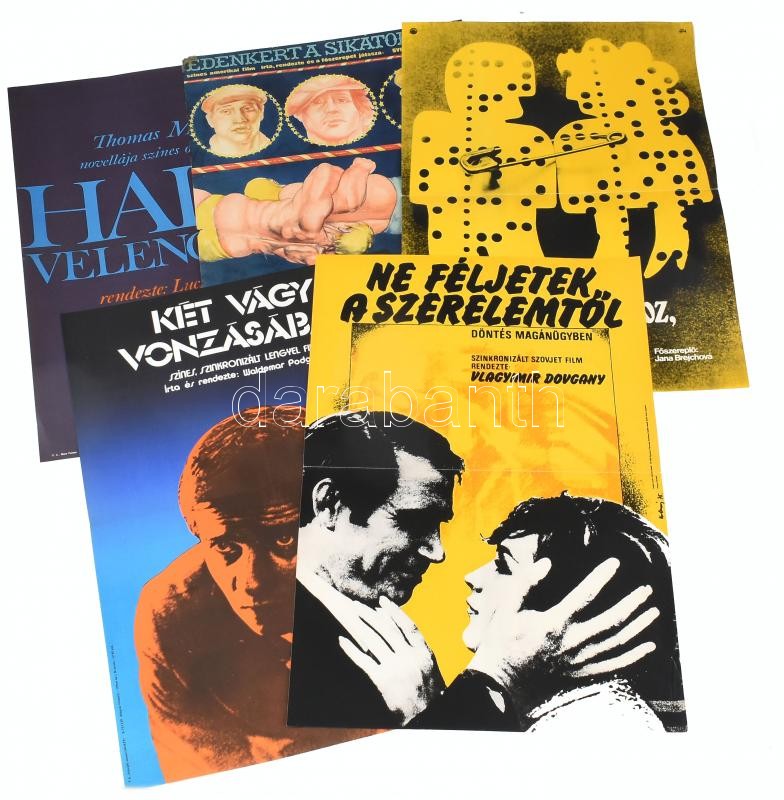 cca 1975-1981 5 db filmplakát: Halál Velencében, Édenkert a sikátorban, Illünk egymáshoz, drágám?, Ne féljetek a szerelemtől, Két vágy vonzásában; MOKÉP-MAHIR (közte 3160 pld.), hajtva, vegyes állapotban (sérült is), 57x40 cm körüli méret
