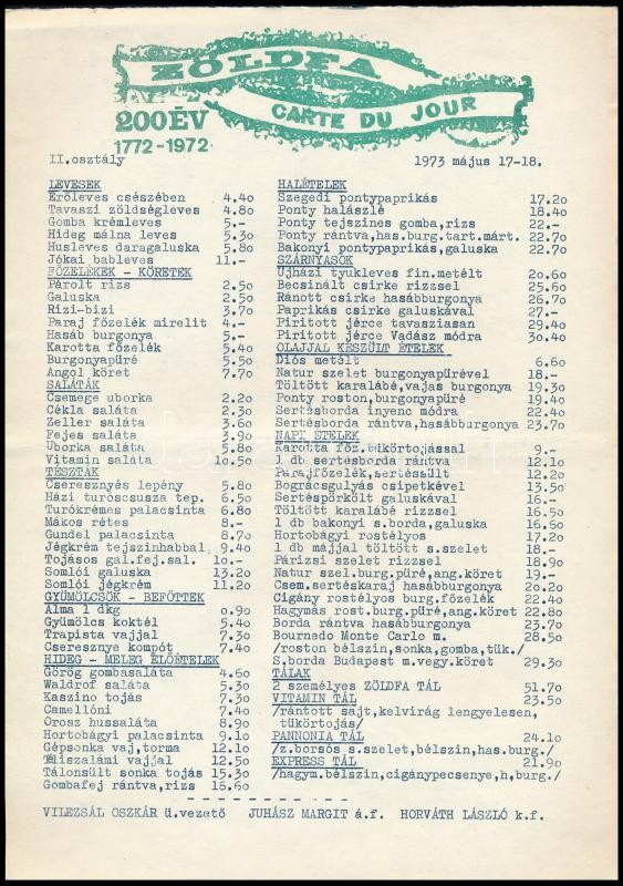 1973 Budapest, Zöldfa étterem étlapja, hajtásnyommal.