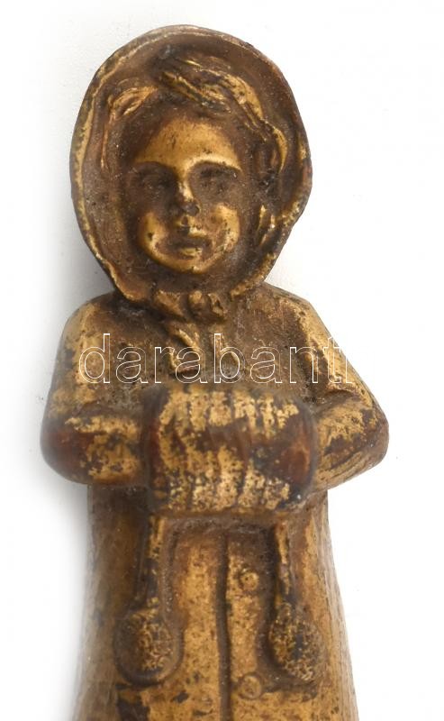 Kislány, muffal. Réz szobrocska, jelzés nélkül, talpazatra erősíthető. Szobor mérete 9 cm