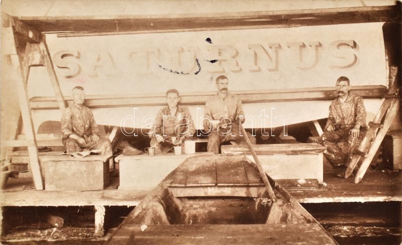cca 1900 Dunai hajósok, háttérben a Satrunus hajó oldala. Fotólap 9x14...
